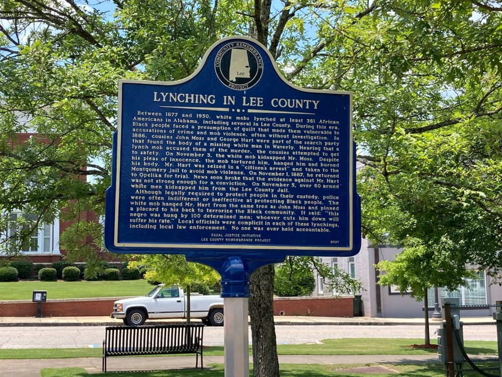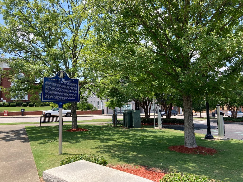 The EV charging station is right next to a plaque from the Equal Justice Initiative about lynching both in the U.S. and in the county. The EJI has a museum in Montgomery I have not yet visited but seems well worth the visit, The Legacy Museum, which opened in 2018. It’s good to have plaques like these to help correct the official record, which glosses over the ugliness and allows people to pretend we’re not surrounded by the shadows of our violent past. These plaques are all over the country, too.